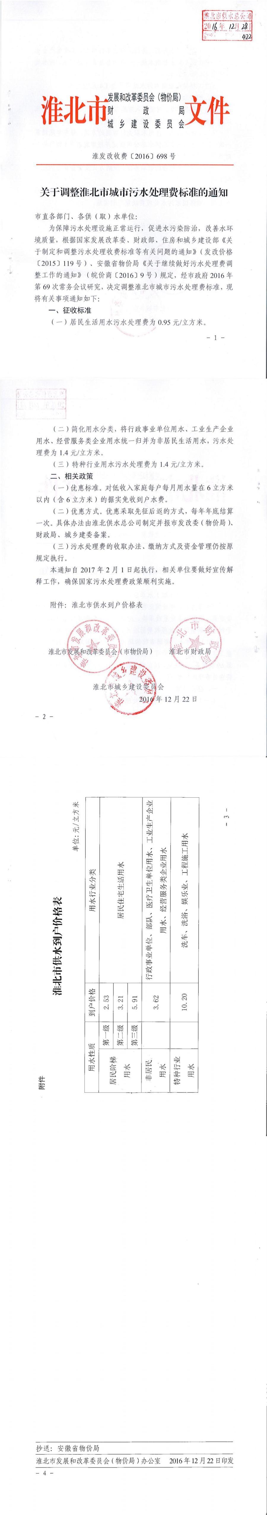關于調(diào)整淮北市城市污水處理費標準的通知 淮發(fā)改收費【2016】698號