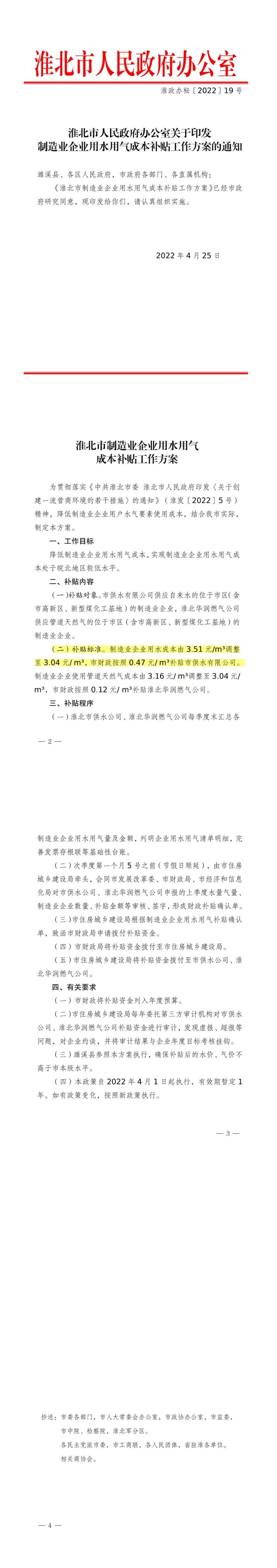 淮北市人民政府辦公室關(guān)于印發(fā)制造業(yè)企業(yè)用水用氣成本補(bǔ)貼工作方案的通知 淮政辦秘【2022】19號(hào)