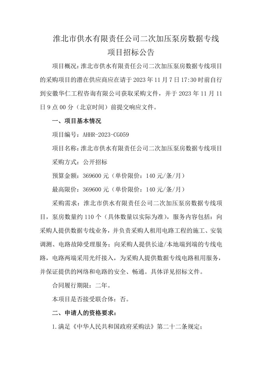 淮北市供水有限責(zé)任公司二次加壓泵房數(shù)據(jù)專線項(xiàng)目招標(biāo)公告