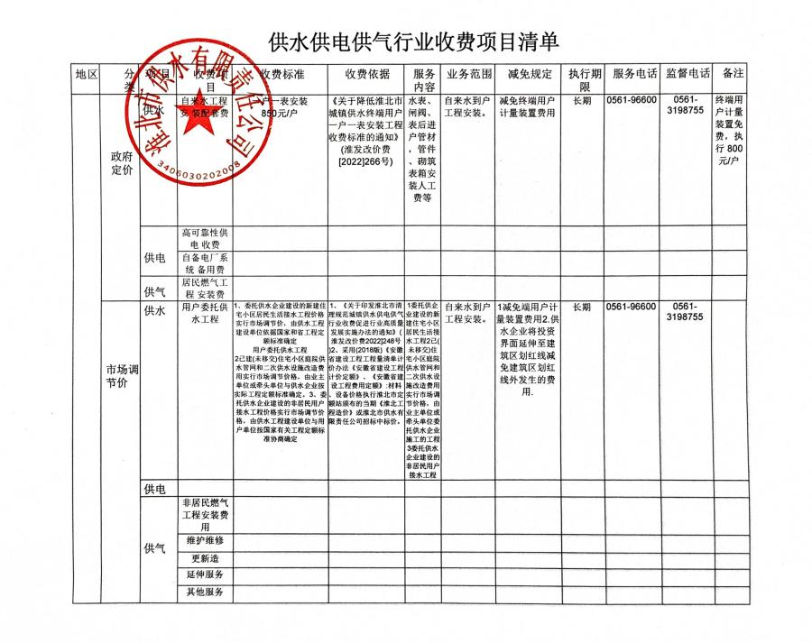 淮北市供水有限責(zé)任公司收費(fèi)項(xiàng)目清單